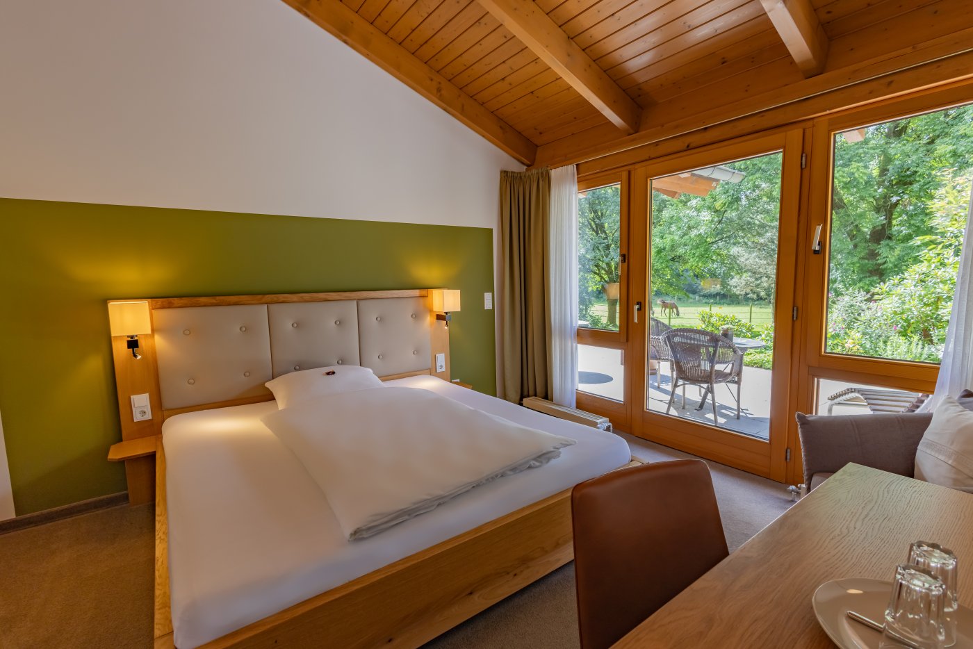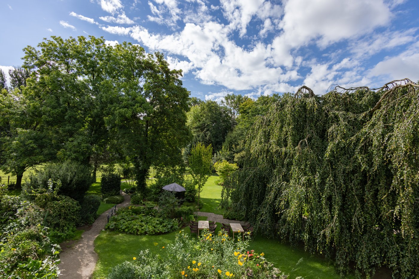 Genießen Sie unser grünes Anwesen! Entspannen Sie in ruhiger, naturnaher Atmosphäre auf Ihrer Terrasse, Ihrem Balkon, auf der großen Terrasse vor unserem Restaurant oder suchen Sie sich ein ruhiges Plätzchen in unserem Park.