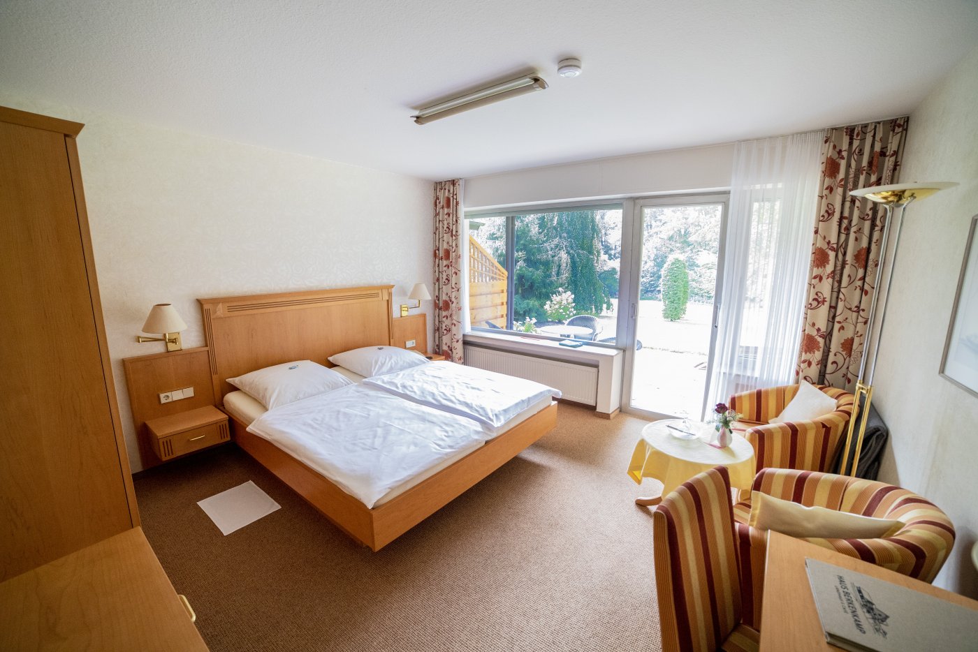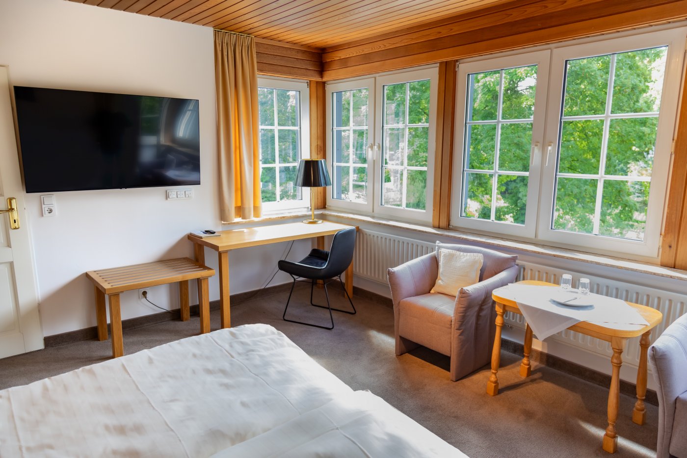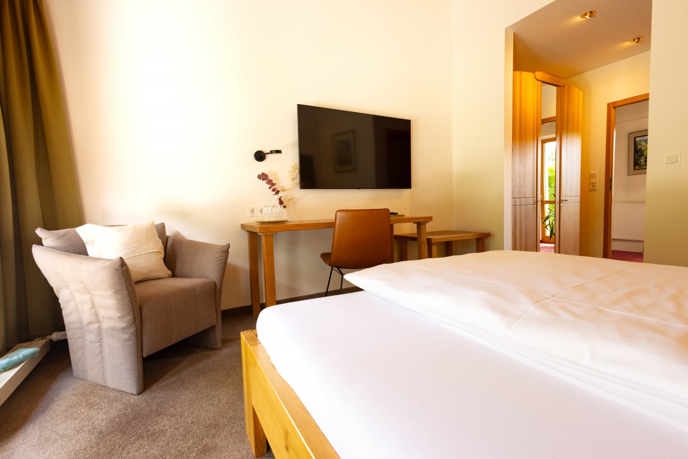 Schon beim Betreten unserer Zimmer werden Sie feststellen, dass der erste Blick aus dem Fenster Ihre Aufmerksamkeit auf sich zieht. Die Sicht in den herrlichen Garten und die grüne Landschaft um unser Haus ziehen jeden in den Bann. Unsere Zimmer sind gemütlich gestaltet und sind alle mit Bad und/oder Dusche, Fön, Kosmetikspiegel und einem eigenen WC ausgestattet. Sie haben einen Flachbildschirm, WLAN-Empfang, einen Schreibtisch und eine Sitzecke. Bis auf sehr wenige Ausnahmen, haben die Zimmer entweder einen Balkon oder eine eigene Terrasse.